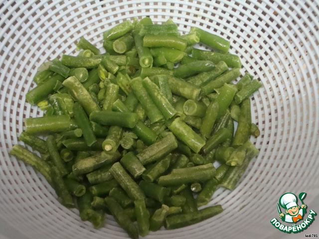 Фасоль разморозить при комнатной температуре. Залить кипятком на 3-4 мин., затем откинуть на дуршлаг и обдать холодной водой.