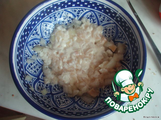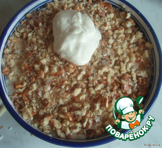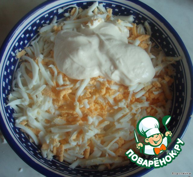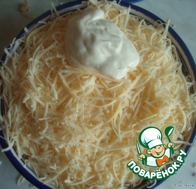 6 слой - тертый сыр+майонез (сыр потереть на терке помельче).