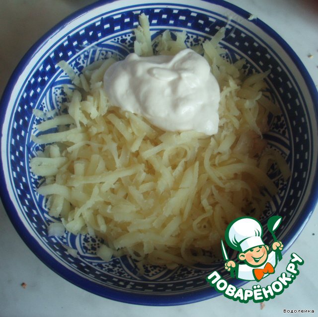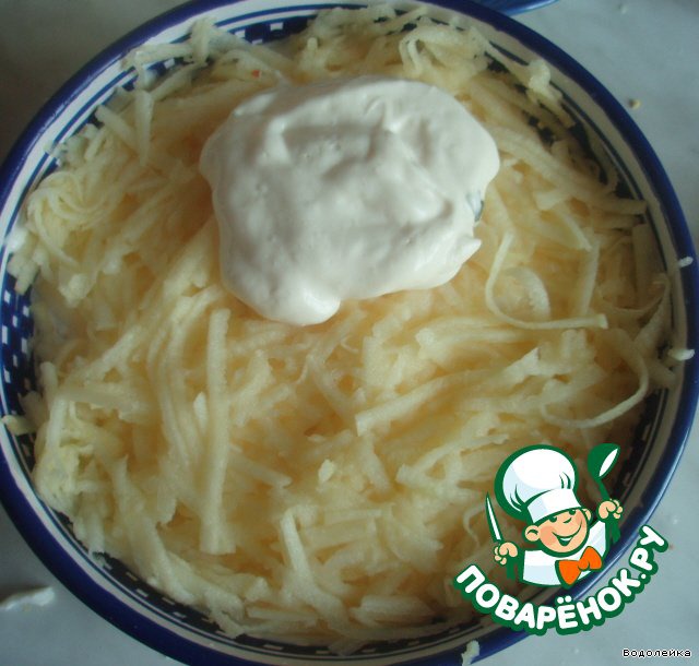 2 слой - тертый картофель+майонез (я терла на крупную буряковую терку).