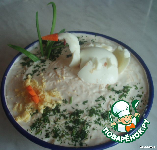 Сверху украсить так, что вроде бы это пруд. Украсить стрелками зеленого лука, сделать лилии, посыпать немного зеленью. Посадить при желании лебедя(его сделать из яичных белков).
