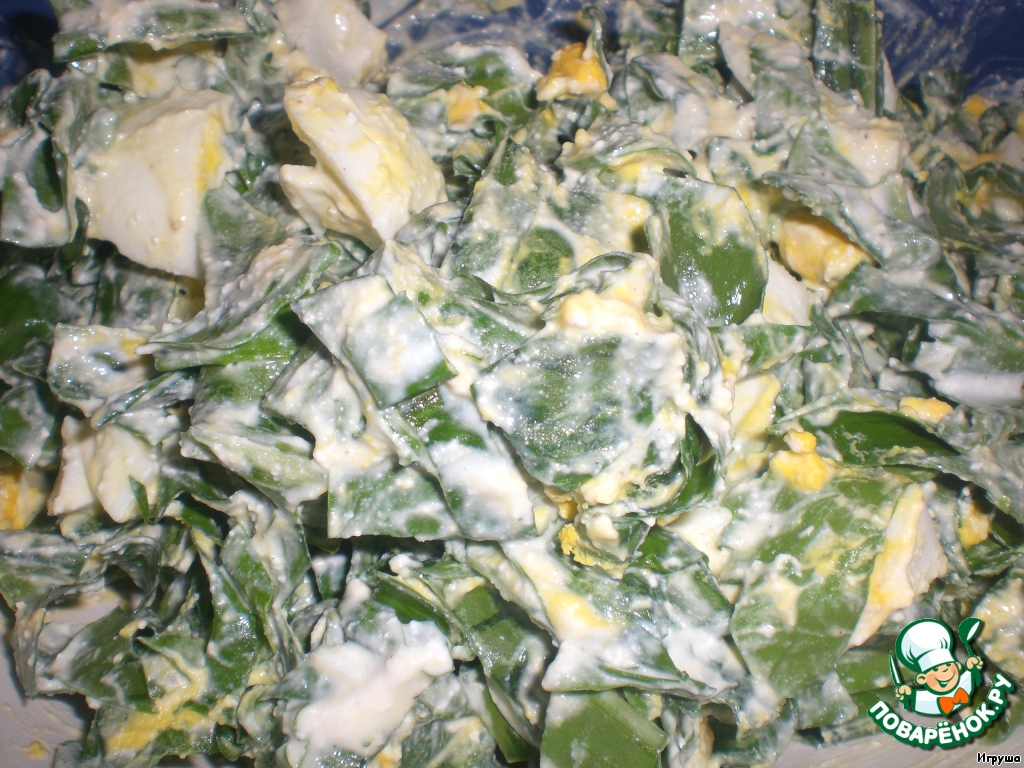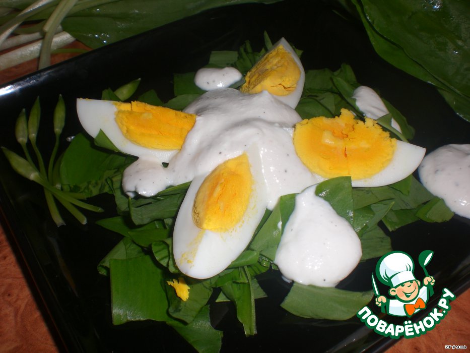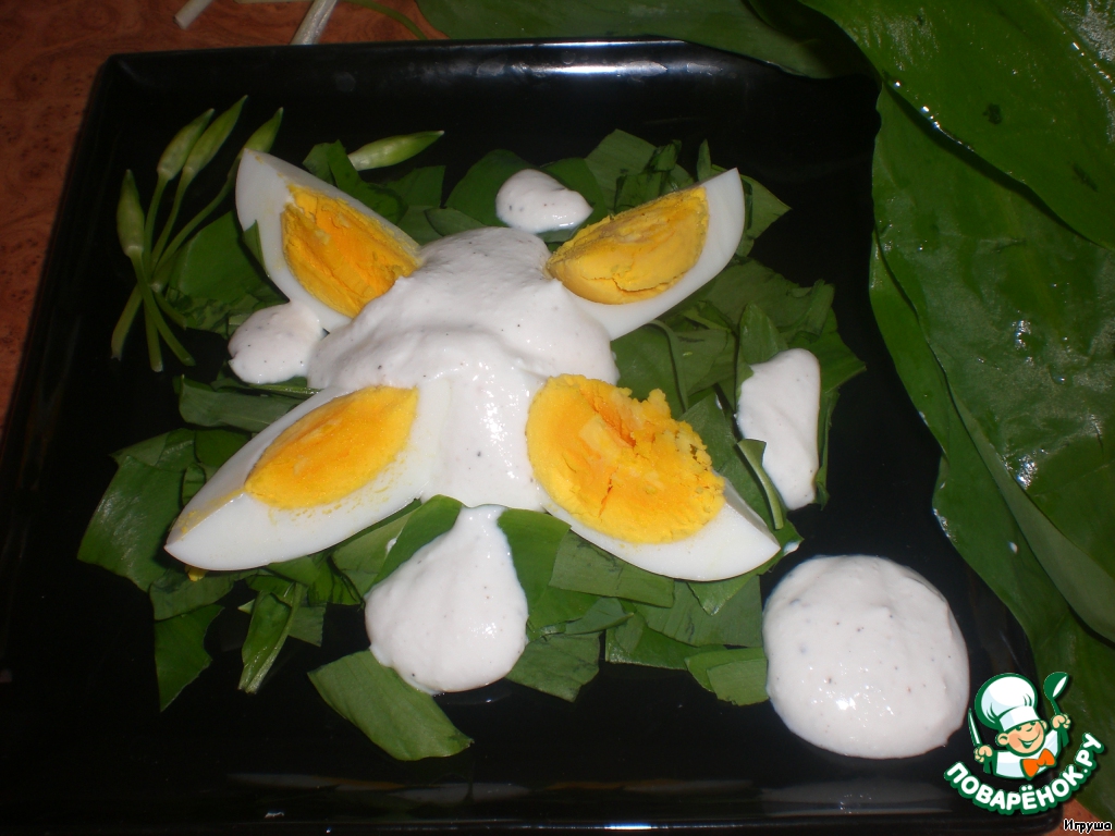 Черемшу соединяем с яйцами и поливаем заправкой.