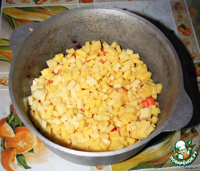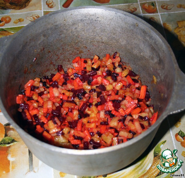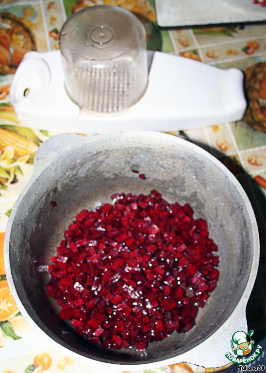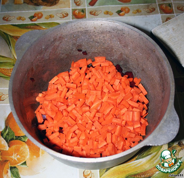 Режим свеклу, кубиками среднего размера. Перекладываем в казанчик.
