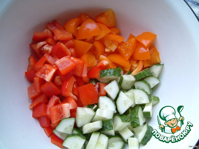 В салатницу нарежте помидоры, огурцы и паприку кубиками.
