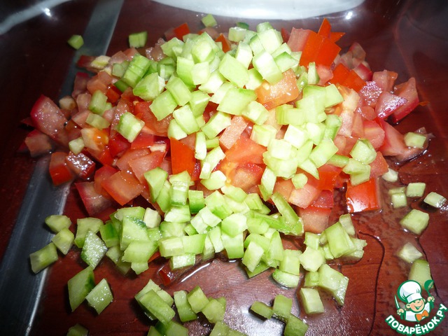 Мелким кубиком нарезаем помидор и огурец.