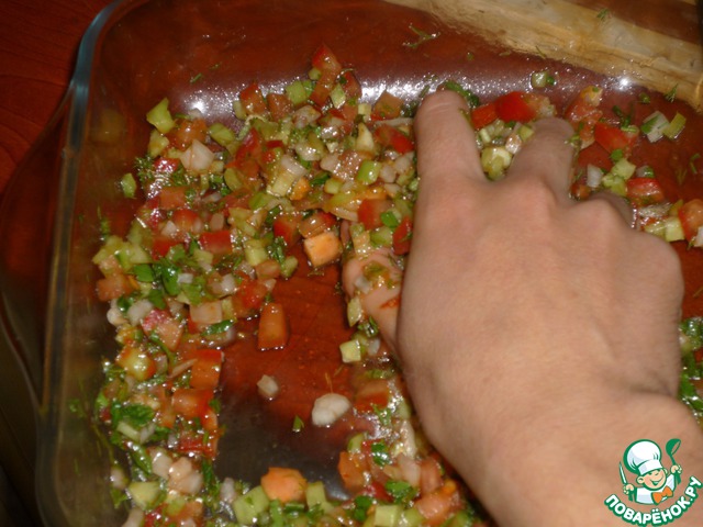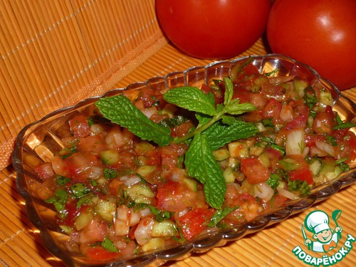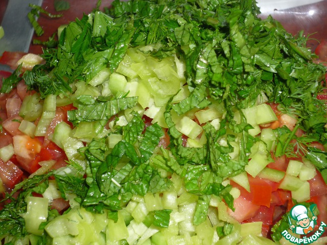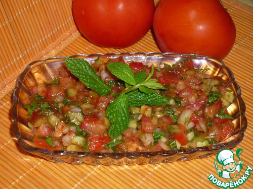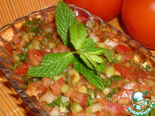 | Аджылы эзме. Для любителей остренького и турецких салатов-закусок. Прекрасное сочетание овощей, зелени и заправки. Остроту можно регулировать количеством перца. Хорошо подходит к мясным блюдам. |