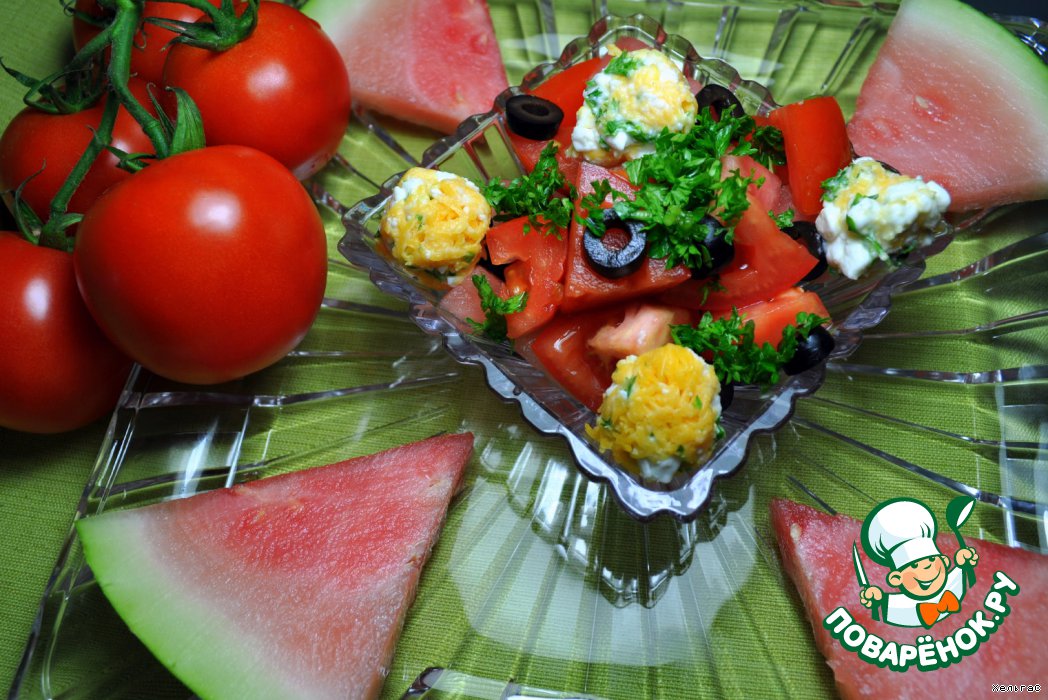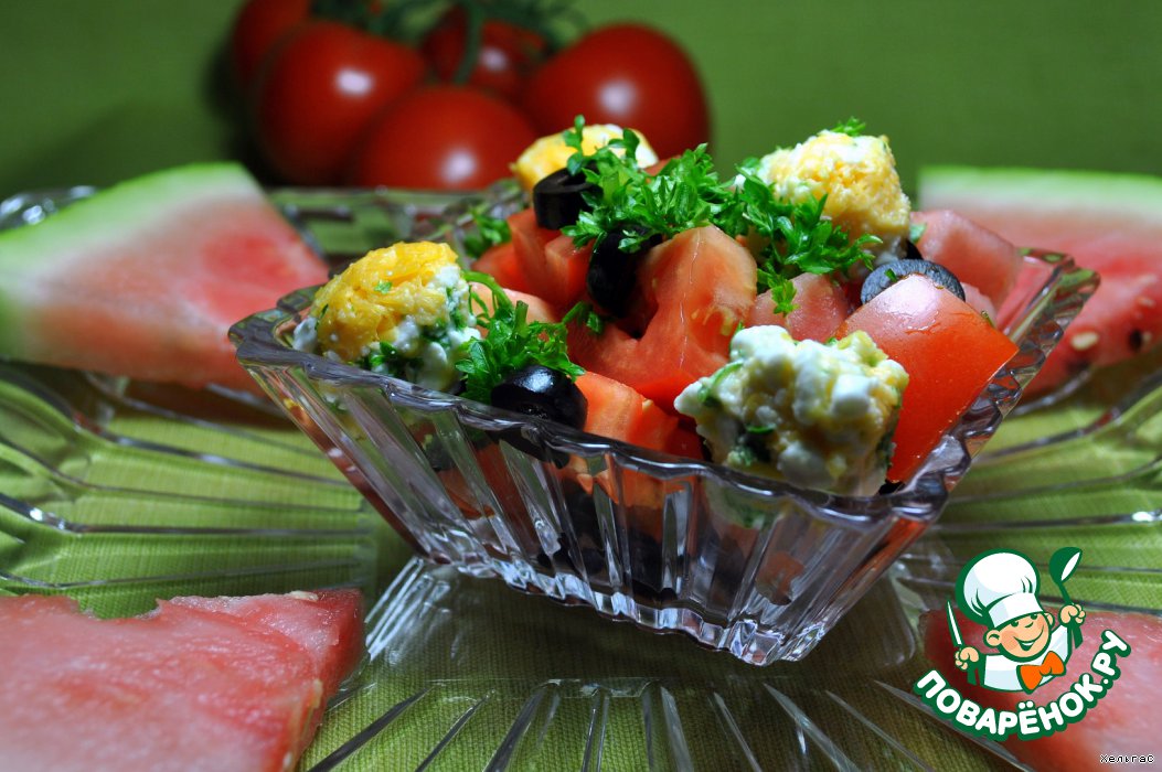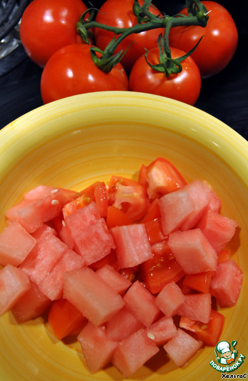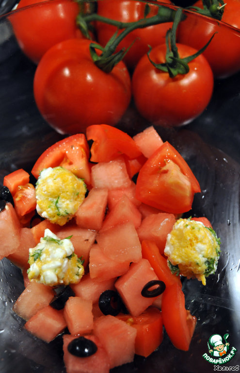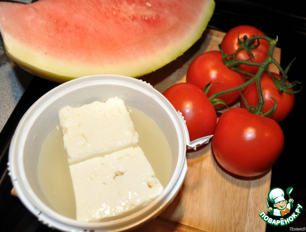 Основное для салата - это арбуз, помидоры и сыр - фета
