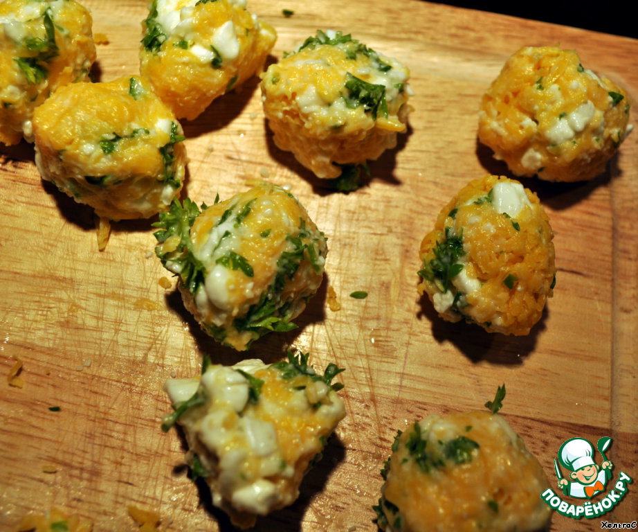 Формируем из массы шарики и "обкатываем" их в протертом сыре