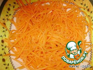 Морковь натереть на специальной терке или нарезать тоненькими длинными брусочками.