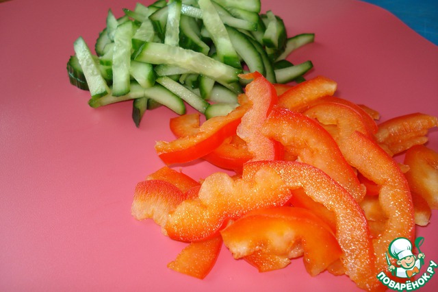 Всё переложим в салатник и совсем чуть-чуть посолим, чтобы огурцы с перцем отдали лишнюю воду.