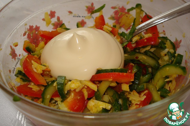 Добавляем ложечку домашнего майонеза, перемешиваем и всё, салат готов!