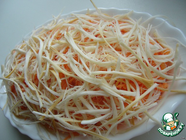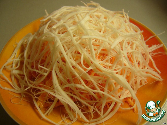 | Никого не хочу удивить составом этого остренького салата. А вот кучерявость морковки заслуживает внимания. Ваши гости не сразу поймут, что скрывается под пышной шевелюрой… |