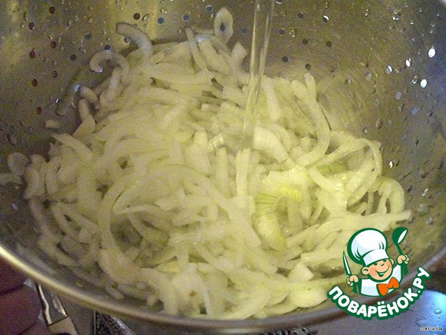 Кладем в дуршлаг и хорошо промываем под ХОЛОДНОЙ проточной водой, хорошо отжимая и перемешивая лук под струей воды.