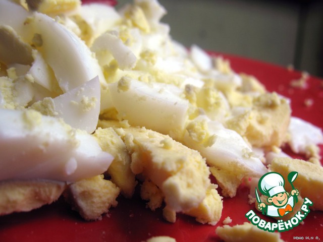 Яйца порубить, оставив одно целым (его в конце порезать на четвертинки и оставить для украшения).