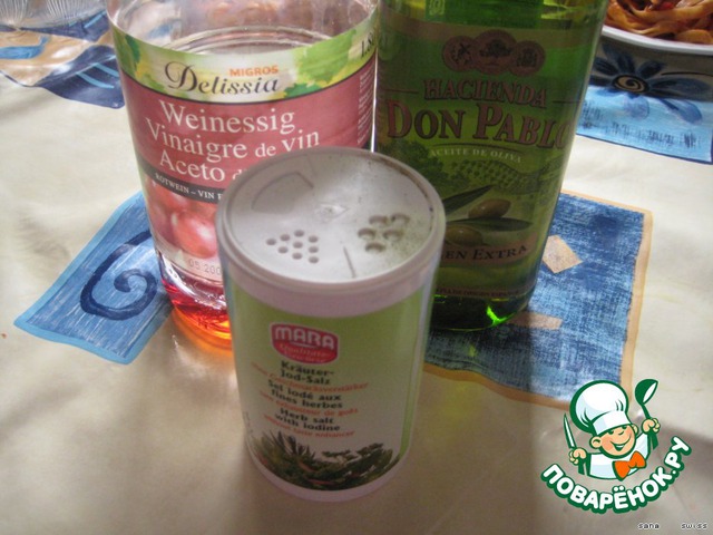 Соус: хорошо перемешать оливковое масло, уксус красного вина, уксус бальзамический, соль, перец белый.