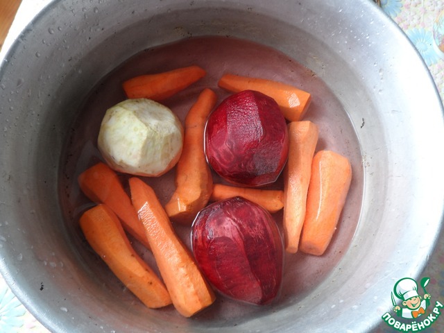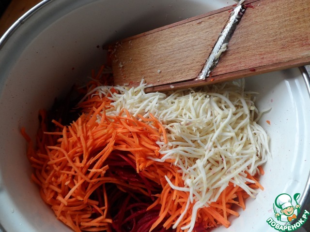 Всё делается проще простого, так что описывать особо нечего. У меня все овощи, выращенные своими руками. Мою их, чищу и оставляю в воде минут на 20-30 (что бы стали более упругими и легче было натереть на терке)