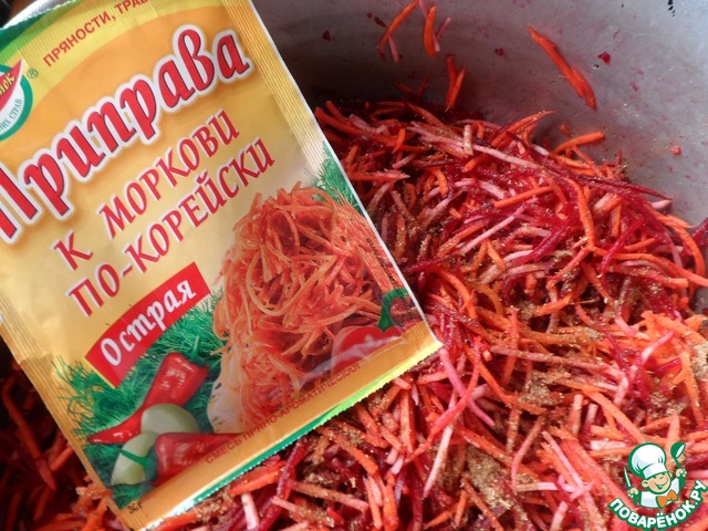 Добавляю сахар и соль, перемешиваю. Потом добавляю мелко натертый чеснок, специи (у меня готовая смесь для корейской моркови, в её составе молотые: кориандр, черный и красный перцы). В небольшой ёмкости довожу до кипения подсолнечное масло, уксус и заливаю этой смесью овощи, хорошо перемешиваю. Оставить всё это на пару часов "подружиться". Пробую и добавляю по своему вкусу соль или сахар. Я складываю все это в стеклянную банку и храню в холодильнике.