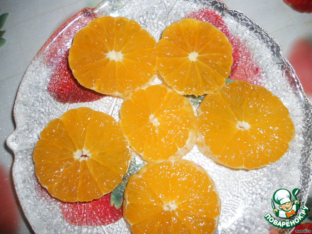 Апельсин очистить, тщательно удаляя белую мякоть. Нарезать тонкими кружочками.