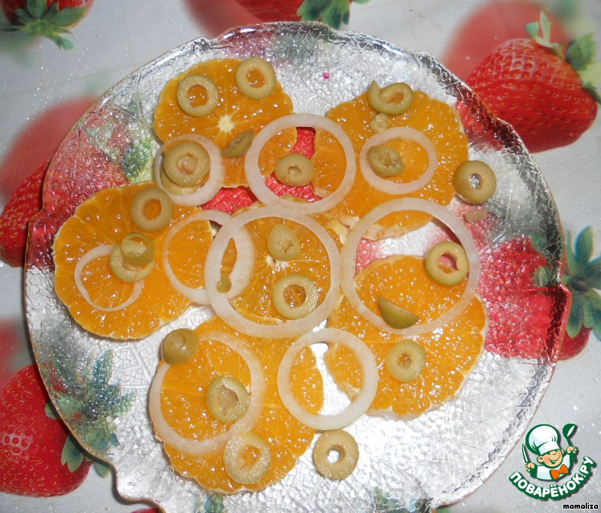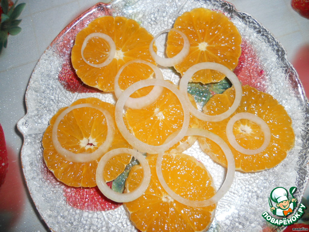 Лук нарезать очень тонкими кружочками, выложить на апельсин.