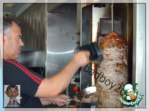 Шварма – это замаринованное мясо, запеченное на вертеле, которое настругивают мелкими кусочками и заворачивают в лафу, большую, пористую лепешку, вместе со всевозможными салатами из овощей, или вкладывают в питу, полую лепешку, размером чуть меньше лафы.