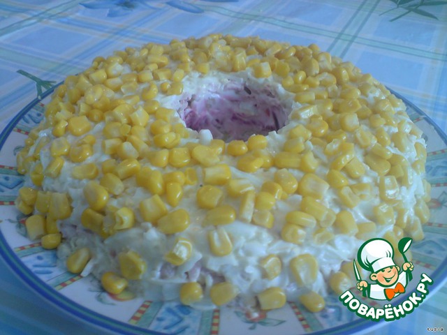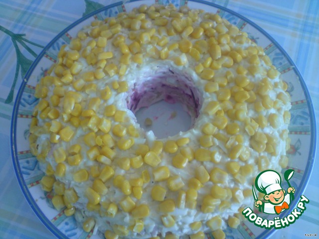 Вытащила стакан, смазала майонезом и украсила кукурузой.