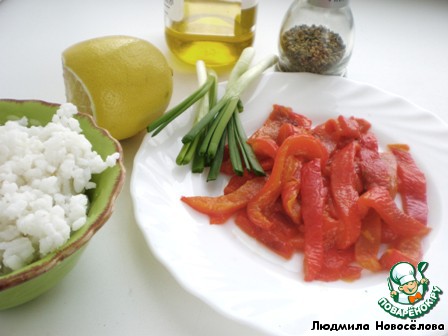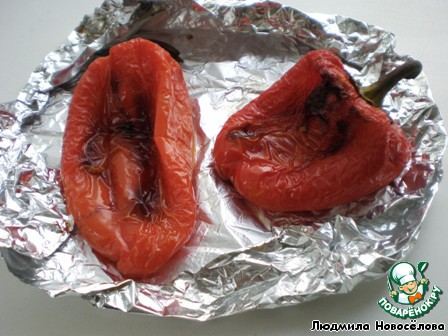Красный болгарский перец сбрызнуть оливковым маслом и запечь в духовке до подпалин. Снять шкурку, мякоть нарезать соломкой, сок от перцев добавить в заправку.