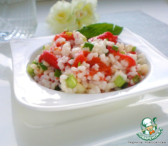 Отварить рис, остудить. Нарезать зелёный лук. Перемешать перец, рис, лук, посолить. Заправка: сок лимона + сахар + оливковое масло + перец чёрный свежемолотый + сок от перцев - всё это хорошо встряхнуть в баночке и заправить салат.