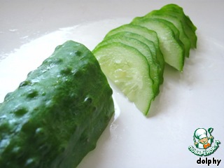 Огурец разрежьте вдоль пополам, а затем нарежьте по диагонали.