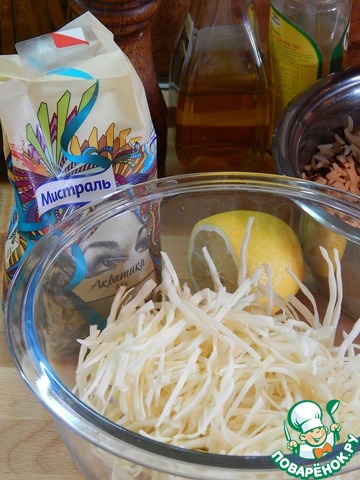 Салат перемешиваем и поливаем смесью масла и лимонного сока. Масло в этот салат лучше брать дезодорированное.