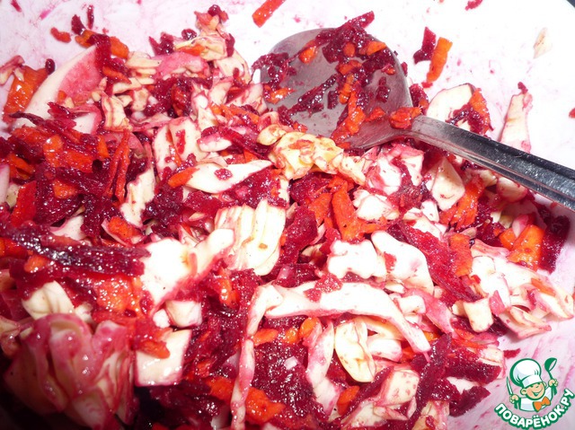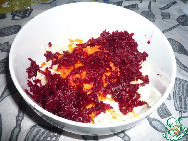 Свеклу тоже натереть на крупной терке, переложить в миску.