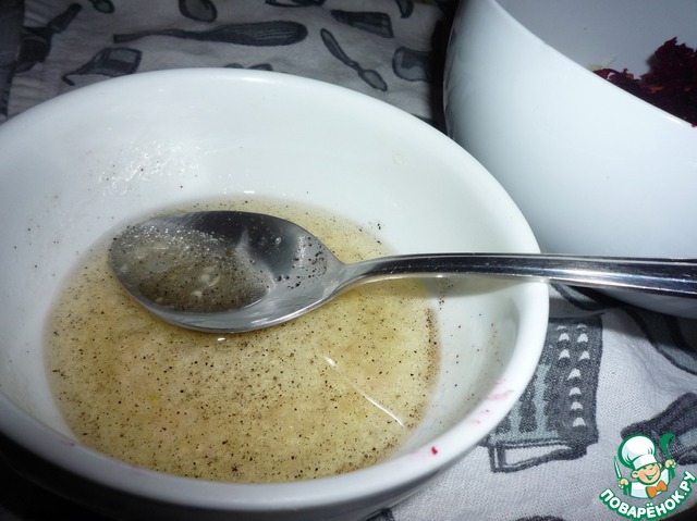 Готовим заправку: смешиваем масло, яблочный уксус или лимоный сок, чеснок пропускаем через пресс, перчим.