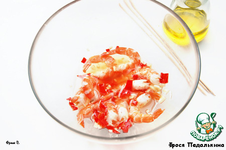 Для маринада смешать мелко нарезанный перец чили (без семян), чеснок и оливковое масло. Креветки разморозить, очистить и мариновать не менее 30 минут.