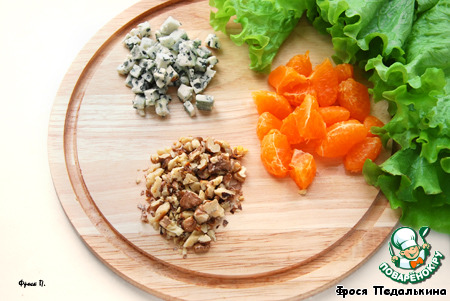 Салатные листья промыть, обсушить, порвать руками на кусочки. Грецкие орехи слегка обжарить на сухой сковороде и мелко порубить. Мандарин очистить и удалить белые перегородки, разрезать дольки пополам. Голубой сыр покрошить.