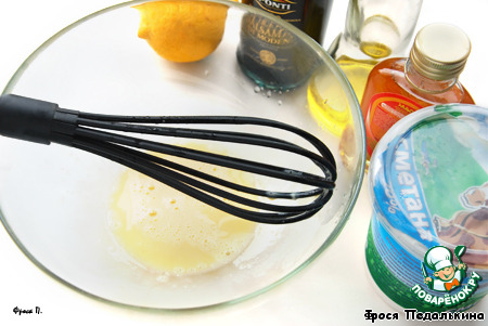 Для соуса: взбить венчиком желтки с лимонным соком или уксусом. Продолжая взбивать, ввести оливковое (100 мл) и ореховое масло. В загустевший соус добавить бальзамический уксус, сметану и перемешать.
