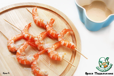 Креветки нанизать на деревянные шпажки по 3 штуки и обжарить без масла 1-2 минуты.