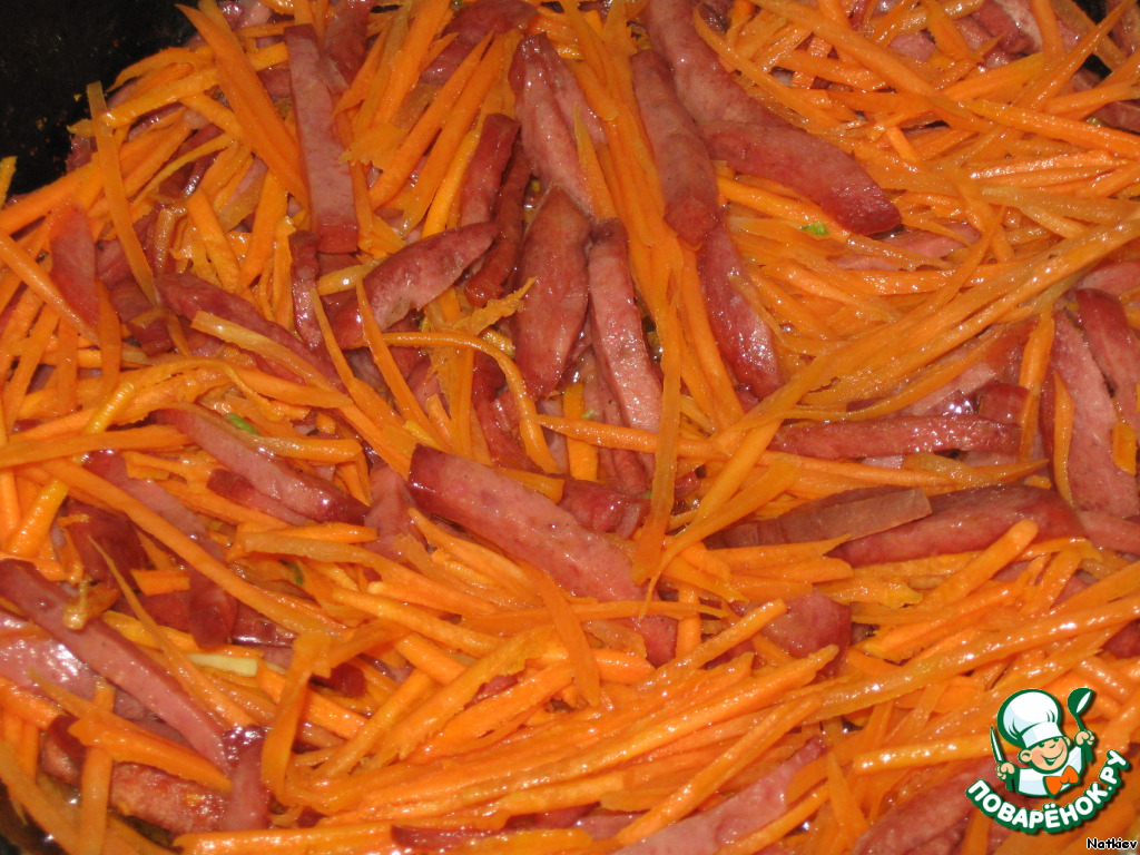 На раскаленном масле пару минут обжарить колбасу и морковь.