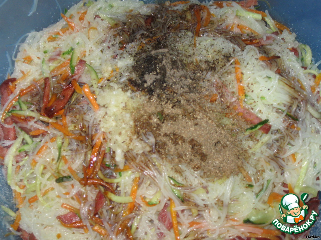 Соединяем фунчозу с огурцом, морковью и колбасой. Хорошо перемешиваем.