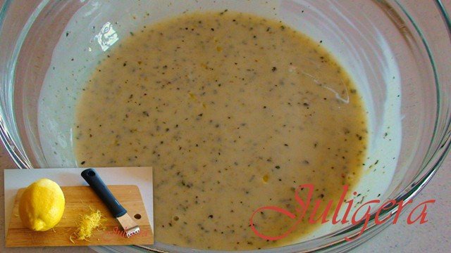 Приготовить заправку: с лимона снять цедру, выжать сок. Йогурт взбить с лимонным соком, порошком карри и щепоткой соли. Добавить лимонную цедру.