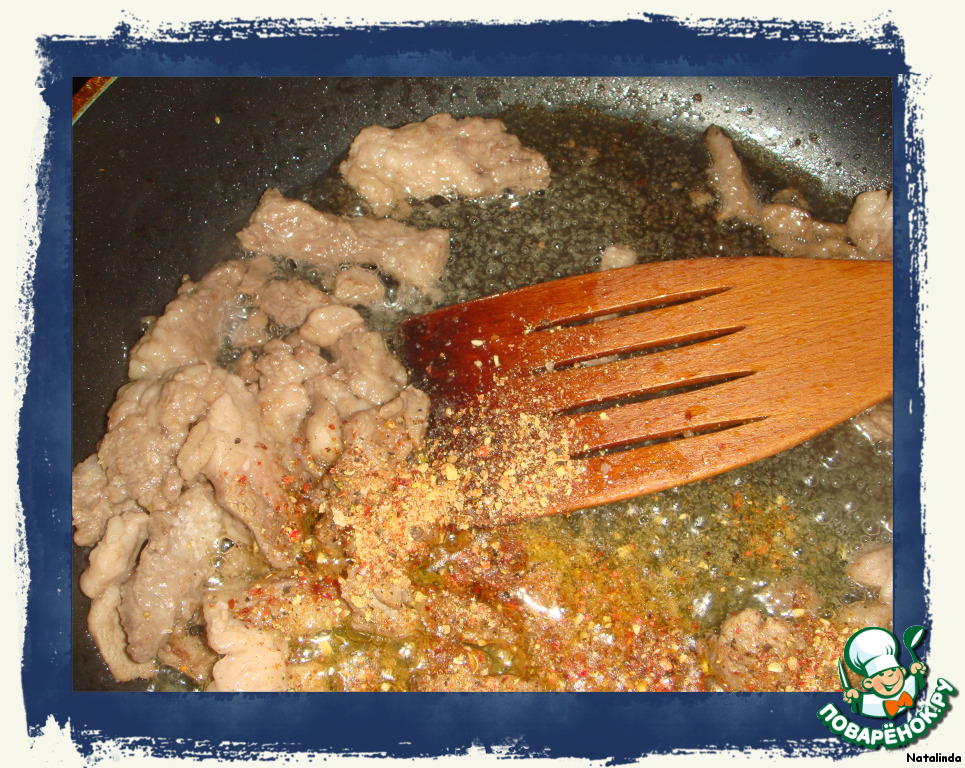 Мясо обжариваем на раст. масле до золотистой корочки, солим, перчим, добавляем приправу