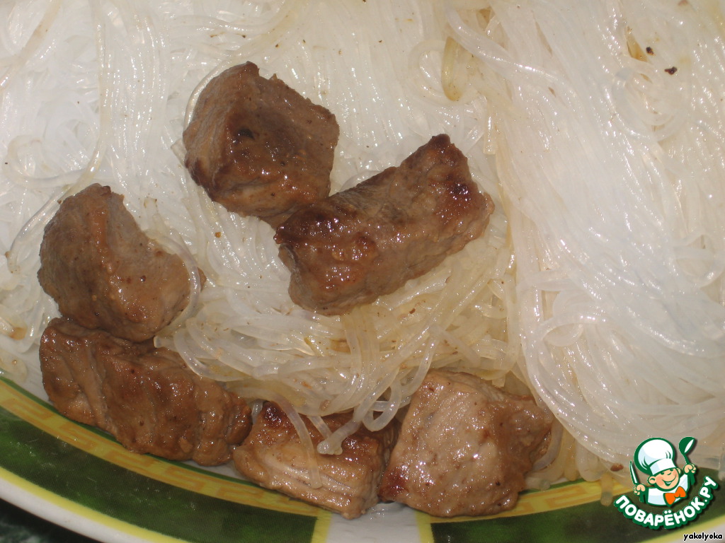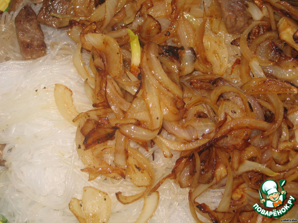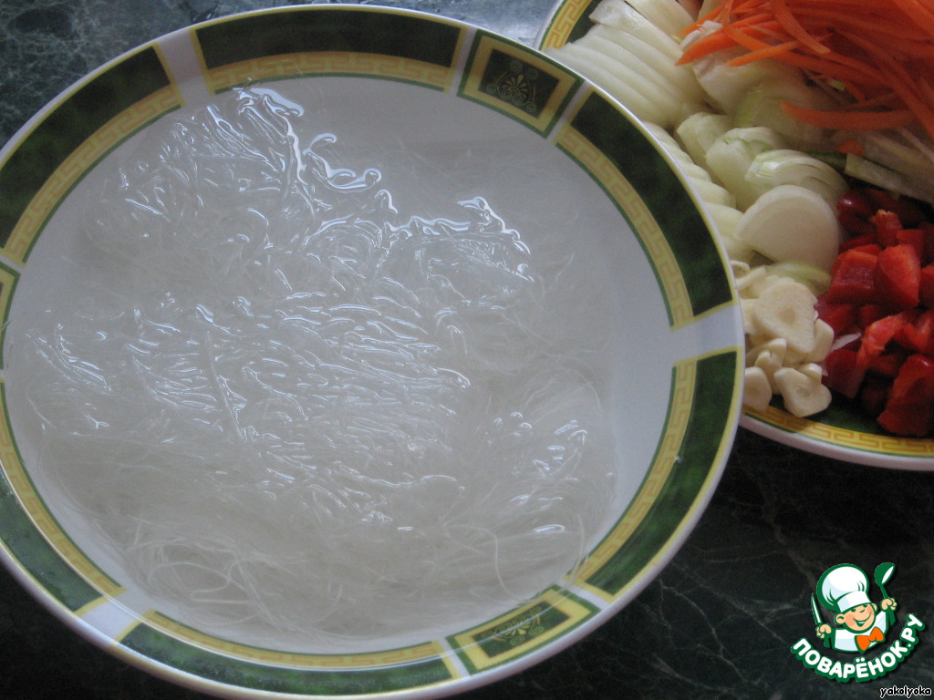 Вермишель замочить на 5-7 мин. в горячей воде. Вынуть, промыть прохладной водой