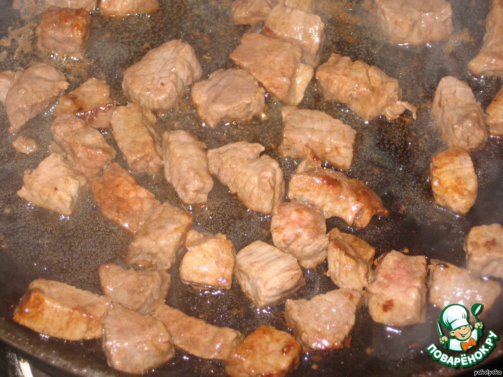 Мясо порезать мелкими брусочками, обжарить на масле (2ст.л.) до золотистой корочки. Вынуть мясо