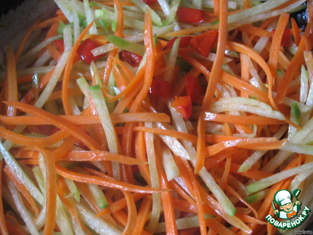 Морковь и редьку порезать тонкими полосками. Если у Вас есть овощерезка, то время приготовления существенно сократится. Я резала руками :( Лук порезать полукольцами, перец брусочками, чеснок пластинками