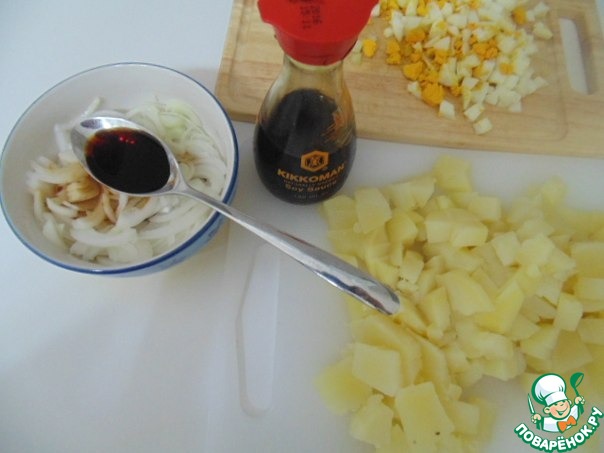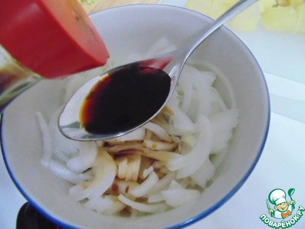 Лук порезать тонкими полукольцами, залить кипятком на 2 минуты, воду слить, в лук влить соевый соус, оставить на 5 минут.