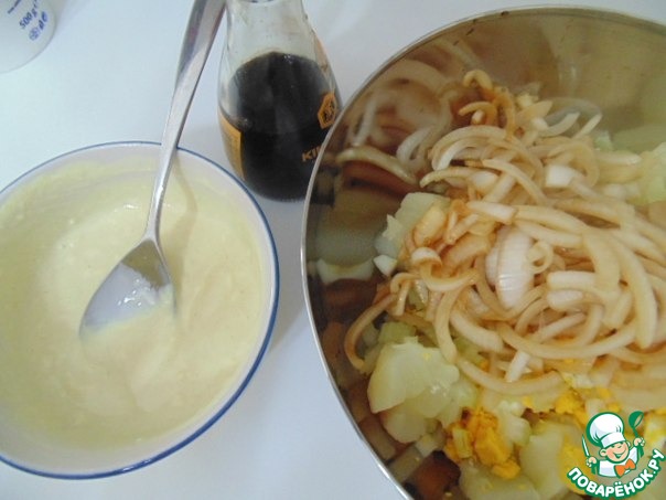 Приготовить заправку: смешать майонез, натуральный йогурт и горчицу.