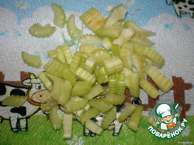 Сельдерей вымыть и нарезать небольшими кусочками длиной 1 см.