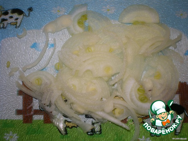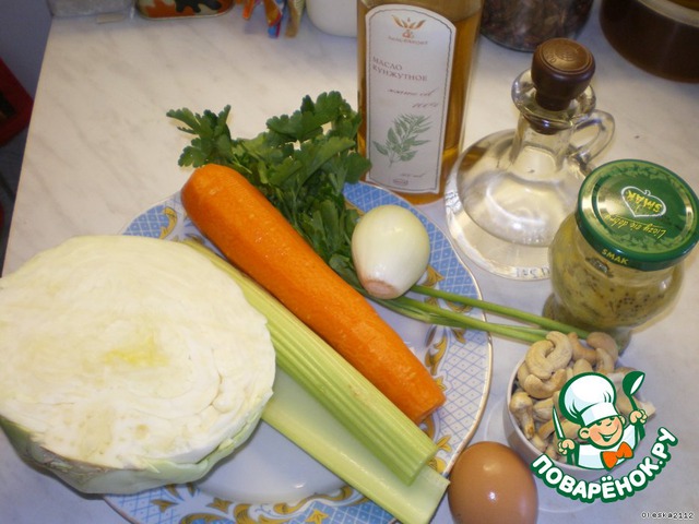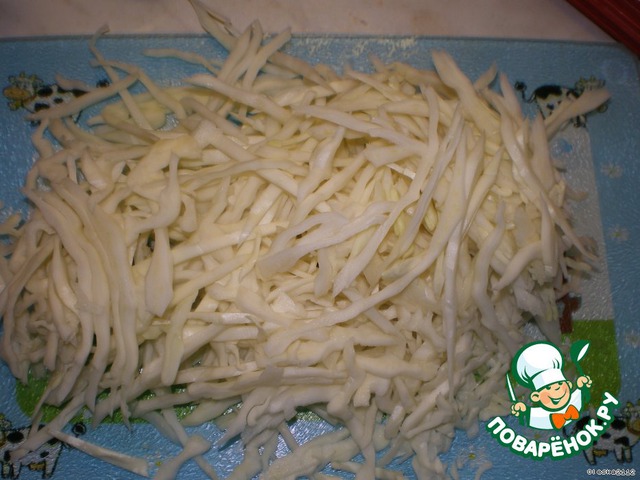 У капусты удалить кочерыжку и верхние листья,тонко нашинковать.Хорошенько "помять" руками.