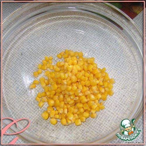 Кукурузу слить, оставить подсушиться. Я взяла маленькую баночку, потому что не очень любим салат наполовину из кукурузы.
