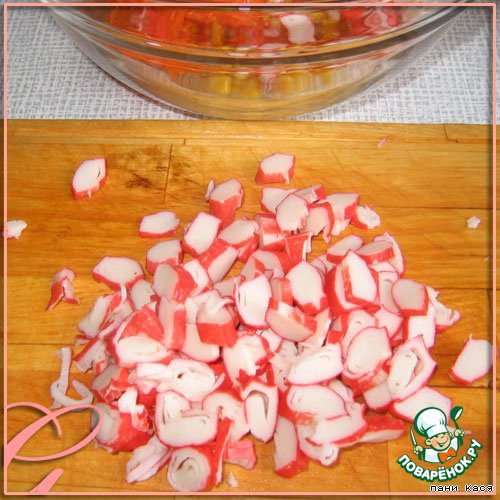 Крабовые палочки я люблю охлажденные, но и замороженные тоже подойдут, конечно. Их нарезать колечками.