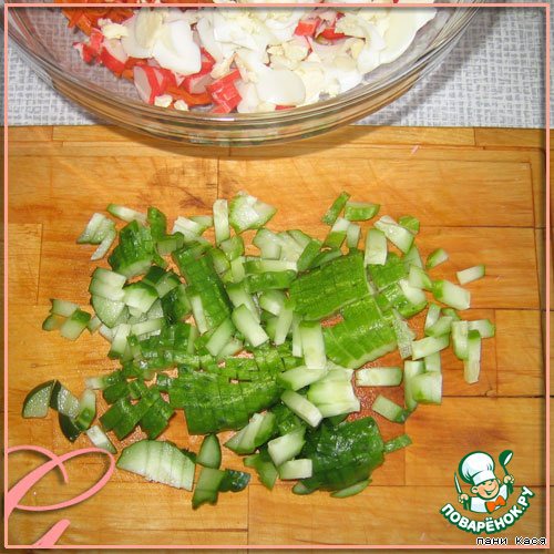 В последнюю очередь режем яйца и огурцы, не мелко, иначе оттекут. Заправляем майонезом прямо перед подачей на стол.