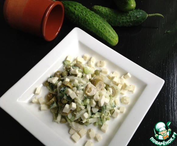 Из горошка слить жидкость и в салатник выложить 5 ст. л. Оливки нарезать кружочками. Огурец нарезать мелкими кубиками, капусту нашинковать
