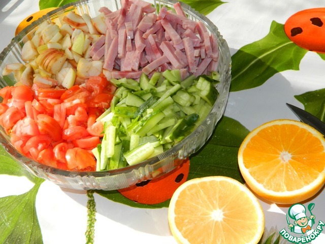 Соединяем все ингредиенты, поливаем свежевыжатым апельсиновым соком.